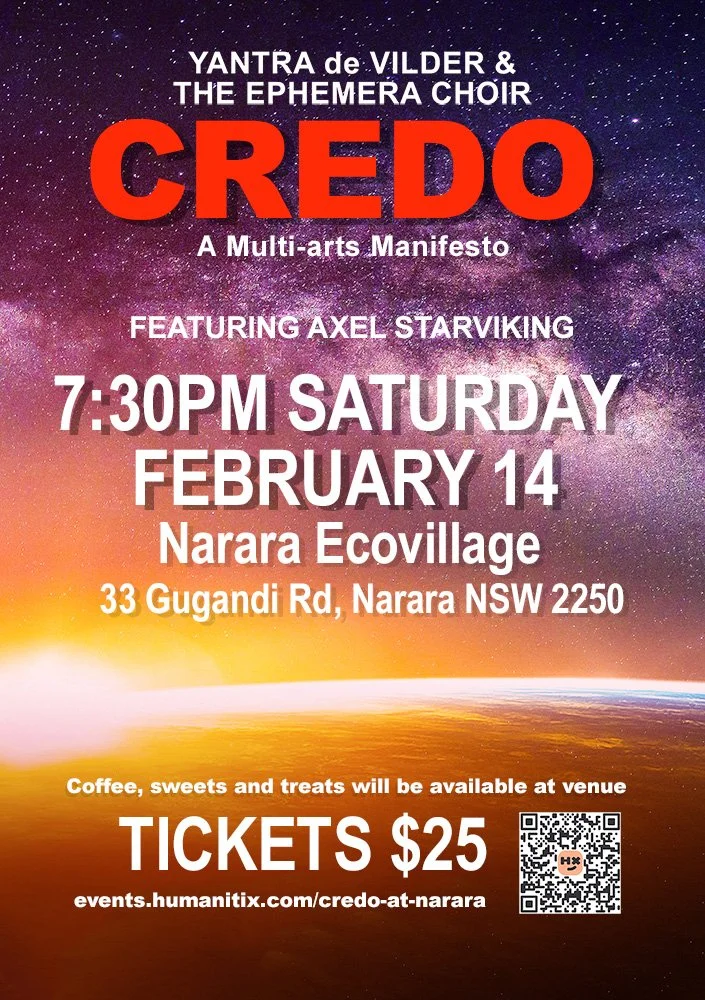 Composed and created by Yantra de Vilder, Credo is a contemporary song cycle expanding award winning music art films from an online film festival audience into a live theatrical event. Immersed in stunning film visuals featuring The Ephemera Choir and Ensemble, this unique production is a form of story telling through a multi-disciplinary artist’s eye. Written during lockdown and the Northern Rivers floods, Credo is birthed within a cauldron of unprecedented global restrictions and a quickening of artistically dangerous moments - a time when singing and dancing were forbidden.